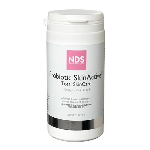 Probiotic Skinactive Total Skincare indeholder udvalgte bakteriestammer. Tarmflorabakterier i pulverform. Indeholder også collagenpeptider. Zink. Vitamin C og E.